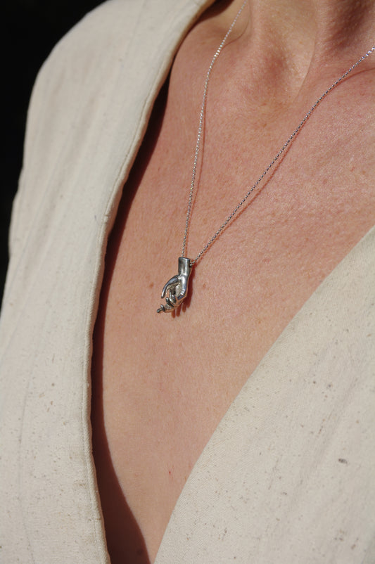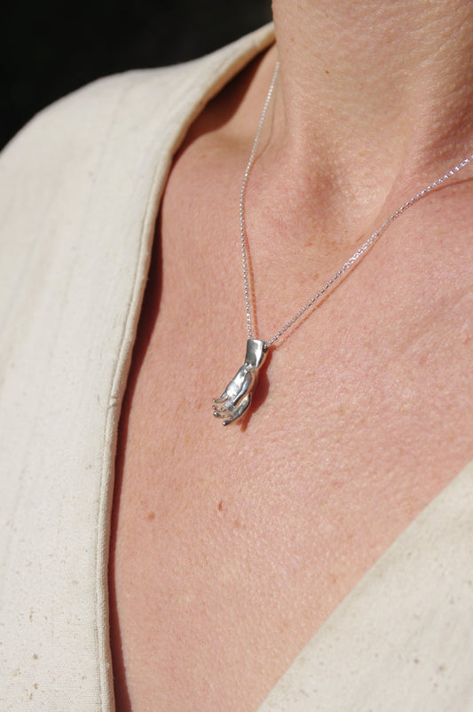 Le Talisman Main est le tout premier bijou que j'ai imaginé et façonné. Ces mains, je les voulais délicates, troublantes, presque vivantes.