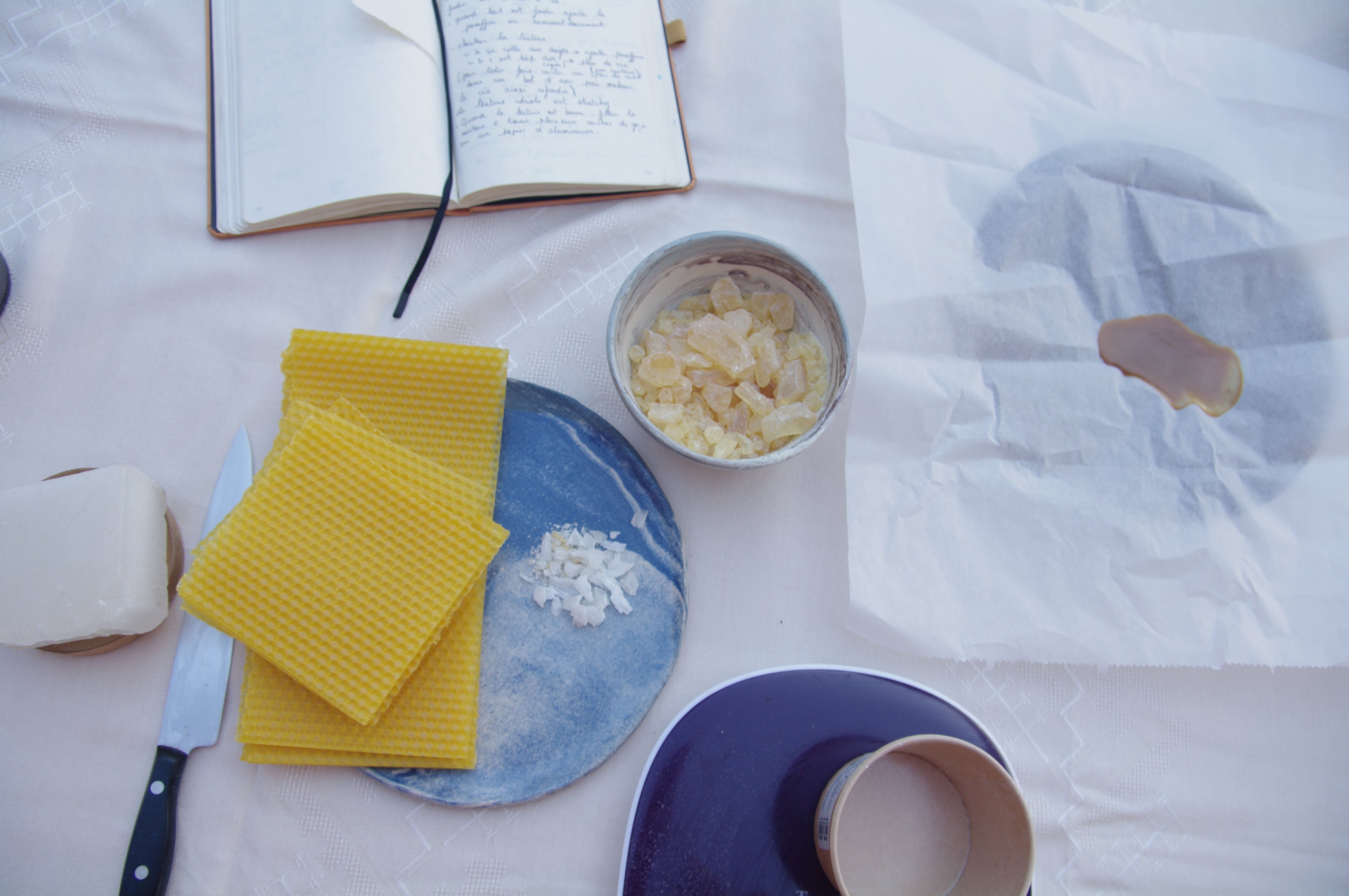 Les indispensables du Mitsuro Hikime : cire d'abeille, résine de pin et un soupçon de paraffine.