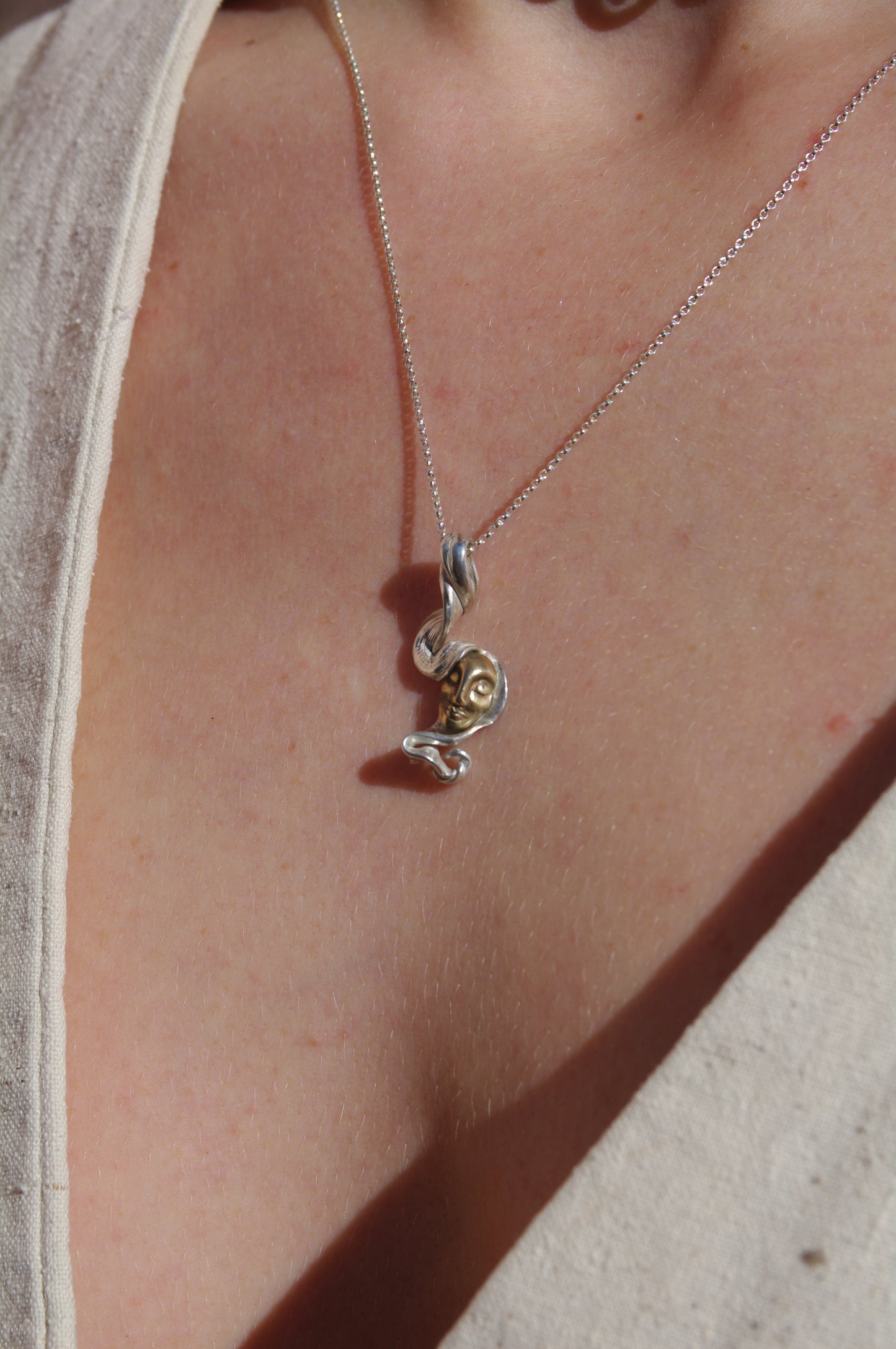 Pendentif au visage endormi, suspendu comme par magie dans un ruban entrelacé.
